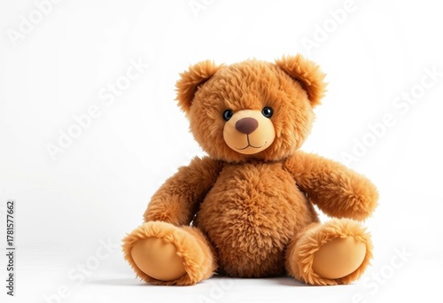 © Chalermrach, Fototapeta premium A fluffy brown teddy bear sits alone against a pure white backdrop, adorable, product photography
