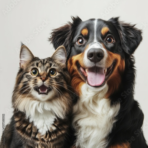 © umut hasanoglu, Fototapeta premium A fluffy cat and a happy dog are posing together in this shot The animals are centered in the frame and looking forward