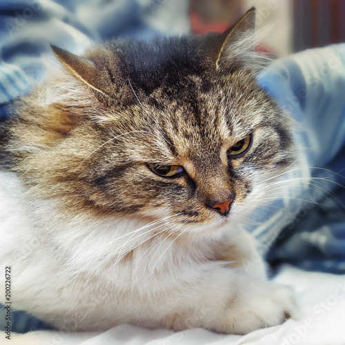 Fototapeta premium .A fluffy cat lies in bed. Focus concept.