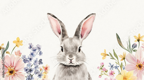 © Denis Yevtekhov, Obraz premium A fluffy grey rabbit surrounded by colorful flowers in watercolor