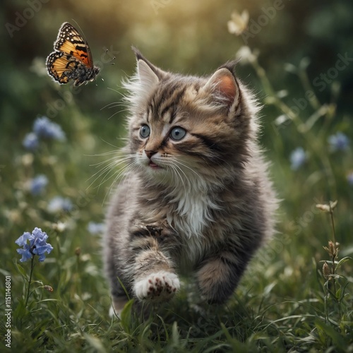 Obraz premium A fluffy kitten chasing a butterfly.