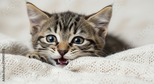 © Idrees, Obraz premium A fluffy kitten relaxing with a soft blurred background, warm gentle lighting, high-quality pet portrait