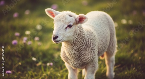 © budi, Obraz premium A fluffy lamb in a grassy field with wildflowers.