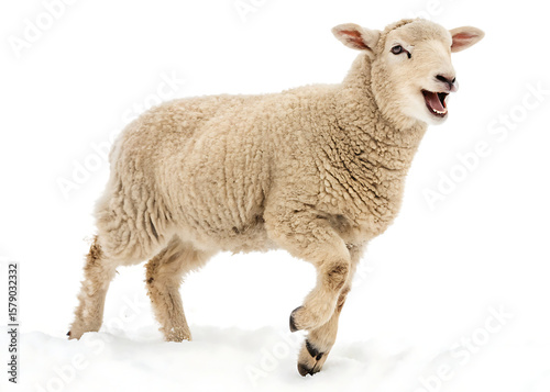 © jamal, Obraz premium A fluffy lamb standing on a white surface with its mouth open and legs in motion on a white background