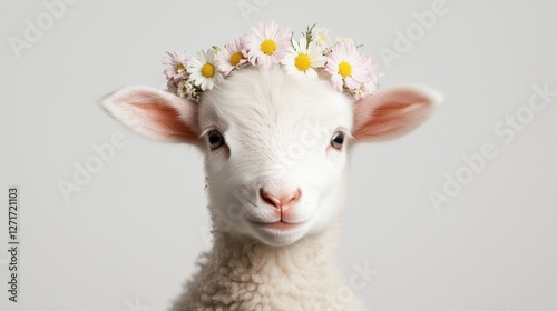 © kept, Naklejka premium A fluffy lamb wearing a crown of flowers, looking directly at the camera against a light background.
