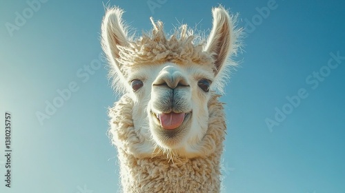 © novri, Obraz premium A fluffy llama looking towards the viewer with its tongue out