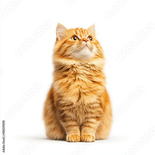 © UnderTheSun, Obraz premium A fluffy orange Cymric cat gazes upwards, showcasing its curious and playful nature against a bright white background.