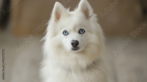 Fototapeta premium A fluffy Pomsky dog sitting gracefully on a , showcasing its striking blue...