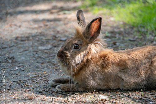 Fototapeta premium a fluffy red domestic rabbit lies on a path in the forest, against a background of grass. Walking a pet