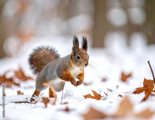 © bocor, Obraz premium A fluffy, reddish-brown squirrel leaping through snowy forest
