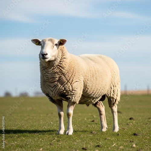 © Roy, Obraz premium A fluffy sheep standing in a green grassy field under a bright blue sky with scattered clouds