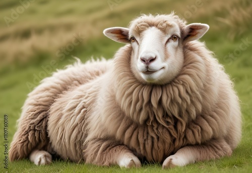 © Pod, Obraz premium A fluffy sheep with a friendly expression resting in a grassy field
