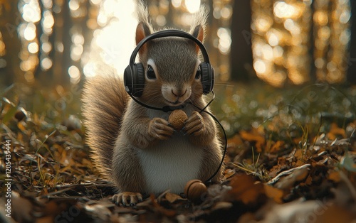 © Sergey Fedchenko, Obraz premium A fluffy squirrel wearing a tiny hoodie and headphones, munching on a nut with a forest backdrop
