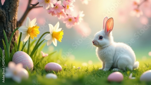 © Angel Pic, Fototapeta premium A fluffy white bunny sits amidst springtime blooms and pastel-colored eggs, a delightful scene of seasonal joy and vibrant nature