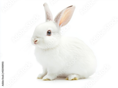 Fototapeta premium A fluffy white bunny sitting, isolated on a white background