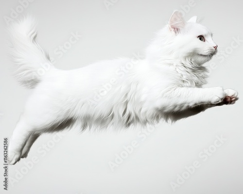 © Morninghead, Fototapeta premium A fluffy white cat is captured mid-leap against a neutral background, showcasing its grace and agility. The image highlights the cat's fur texture and dynamic movement.