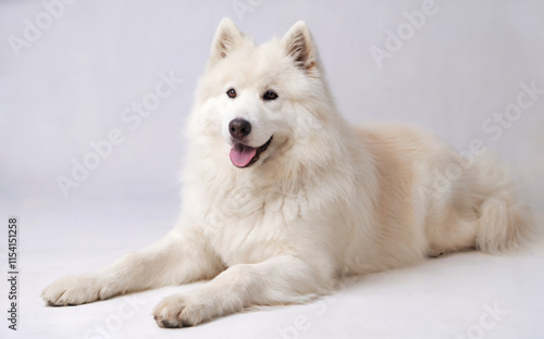 © Pixels Pictures, Obraz premium A fluffy white dog, possibly a Samoyed, lying down with its front legs extended in front of it.