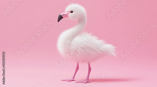 © Penatic Studio, Fototapeta premium A fluffy white flamingo chick stands on pink