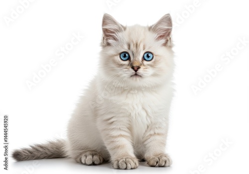 Obraz premium A fluffy white kitten with striking blue eyes sitting against a plain white background in a studio shot