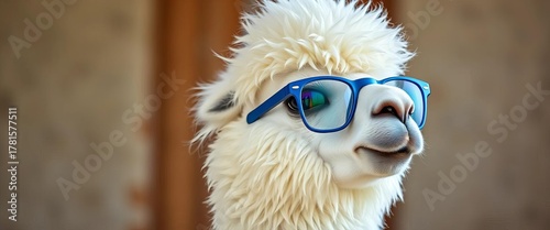Obraz premium A fluffy white llama wearing stylish blue glasses, cute, farm animal