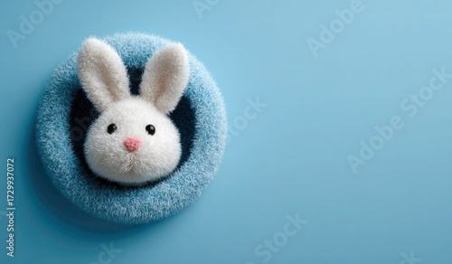 © Divine123victory, Obraz premium A fluffy white rabbit head peeking from a blue speckled eggshell