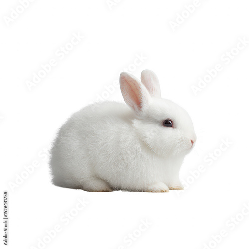 © Natnicha, Obraz premium A fluffy white rabbit sitting calmly, showcasing its soft fur and gentle expression against a white isolated background.