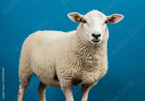 Obraz premium A fluffy white sheep stands against a vibrant blue background showcasing its soft wool and gentle expression a perfect farm animal portrait.