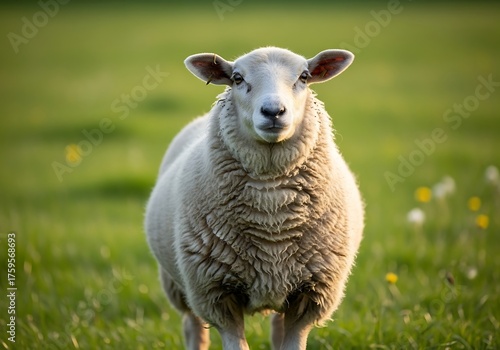 © Cobau, Naklejka premium A fluffy white sheep stands in a vibrant green pasture, looking directly at the camera with soft, warm light.