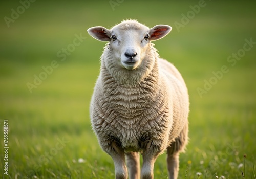 © Cobau, Naklejka premium A fluffy white sheep stands in a vibrant green pasture, looking directly at the viewer with a gentle expression.