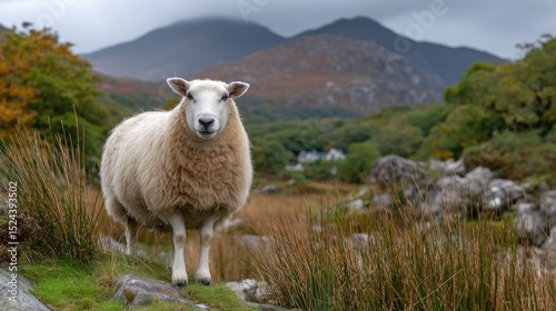 Obraz premium A fluffy white sheep stands in green grass, surrounded by distant mountains...