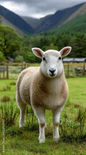 Obraz premium A fluffy white sheep stands in green grass, surrounded by distant mountains...