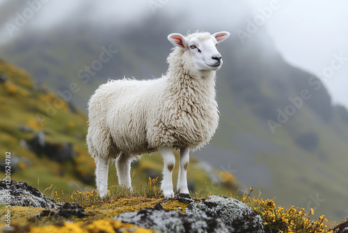 Fototapeta premium A fluffy white sheep stands on a misty mountain