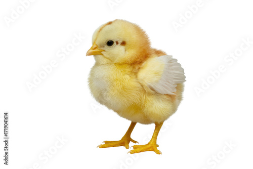 Obraz premium A fluffy yellow chick stands on a transparent background, showcasing its adorable features. background removed