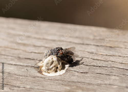 © Piotr, Obraz premium A fly sits on bird droppings. The insect eats excrement. Coprophagia.