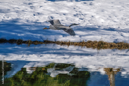 Fototapeta premium a flying grey heron over the water from a mountain lake at a sunny winter day