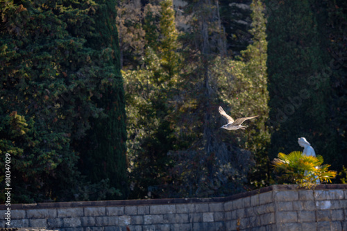 © Nikita Shevchenko, Fototapeta premium a flying gull in the background of trees