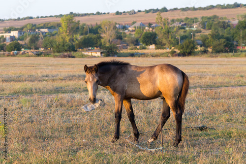 Fototapeta premium A foal is playing with a plastic bottle. Horse in the pasture. Environmental...