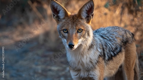 Obraz premium A focused coyote stands in warm sunlight, showcasing its striking features...