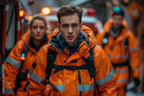 © Larisa AI, Fototapeta premium A focused emergency responder in a high-visibility jacket looks seriously ahead, with colleagues in the background