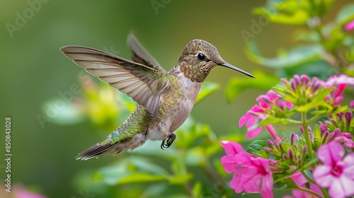 Obraz premium A focused hummingbird mid-flight, approaching a blooming flower, with its...