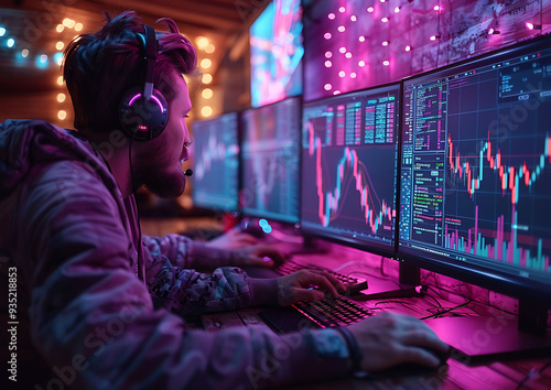 © Thanaporn, Obraz premium A focused individual analyzes financial data on multiple monitors in a vibrant, tech-inspired workspace.