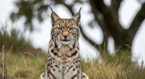 © Creations Photo , Obraz premium A focused lynx sitting in a grassy field with trees in the background.