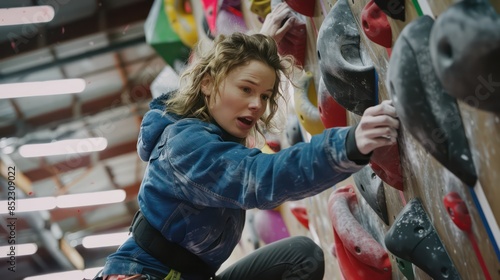 © Matthew, Fototapeta premium A focused woman with a surprised expression is climbing on an indoor climbing wall, reaching for a hold, with colorful holds in the background