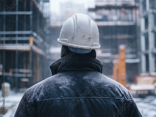 © Maksim Shebeko, Obraz premium A focused worker in a white hard hat stands with his back to the viewer, taking in the snow-covered construction site. The atmosphere conveys dedication and determination amidst winter's chill.