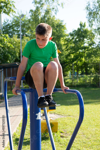 © Niko_Dali, Fototapeta premium A focused young boy performs dips on outdoor fitness equipment. The setting is a sunny park with green grass and trees in the background. He wears a green shirt and dark shorts.