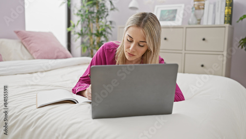 Naklejka premium A focused young woman lies comfortably on her bed at home, working on a laptop and taking notes.
