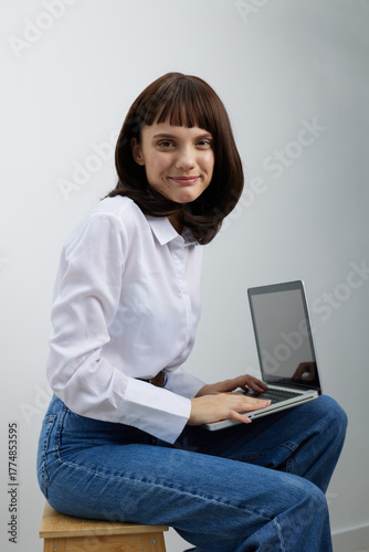Naklejka premium A focused young woman sits on a wooden stool with a laptop in a bright, minimal space. She wears a white shirt and blue jeans, creating a casual yet productive mood for modern work, study, or