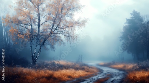 © Nikita44, Naklejka premium a fog-covered forest, creating a peaceful and mysterious atmosphere ideal for seasonal stock imagery.
