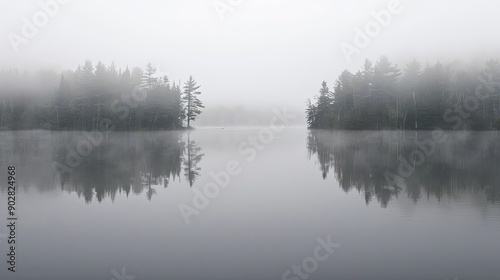 © Nuttaya Nampai, Fototapeta premium A fog-covered lake with trees and reflections barely visible in the water.