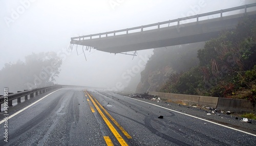 Fototapeta premium A fog-shrouded highway scene with a partially collapsed bridge, debris...